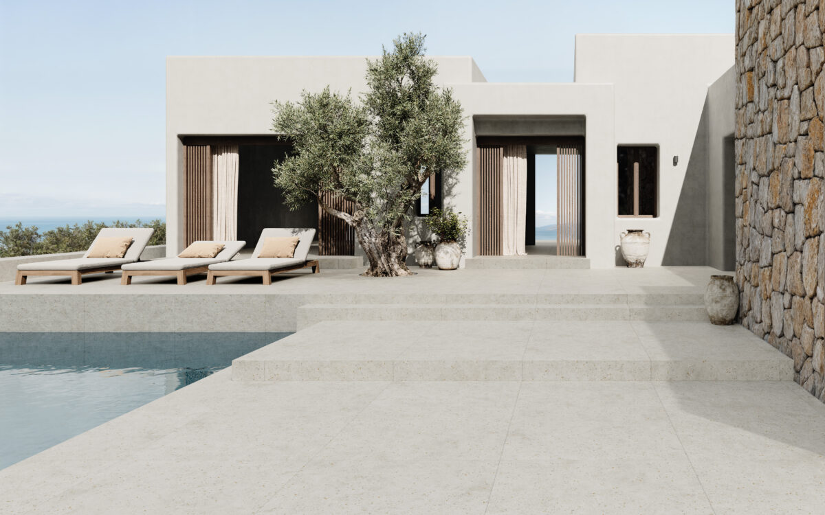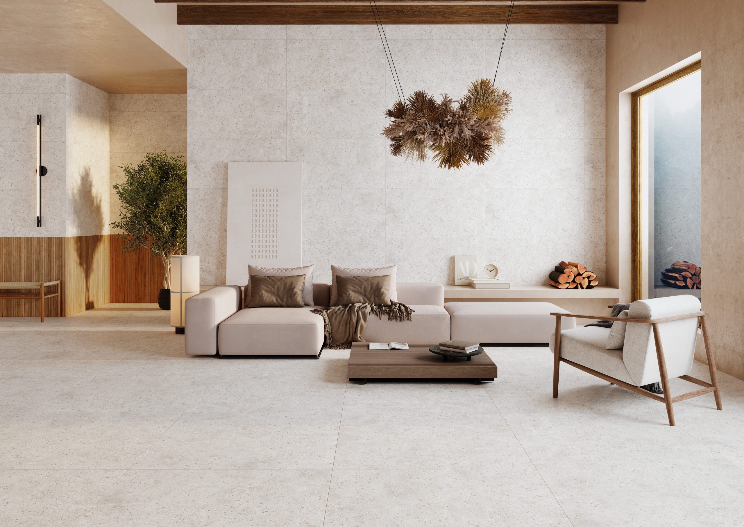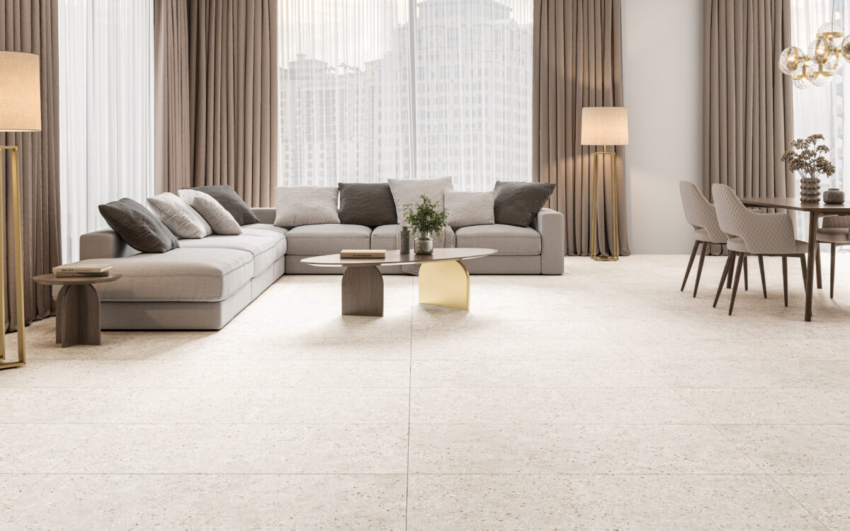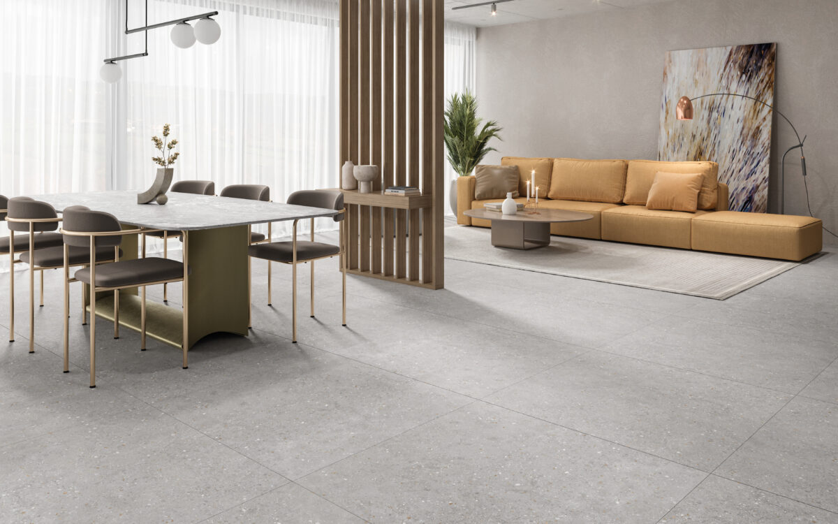 Der Stil unserer mediterranen Serie zeichnet sich durch einen modernen Terrazzo mit grauen, weißen, goldenen und rötlichen Flocken aus. Eine Kollektion mit einer weichen Steinmikroreliefstruktur und einer sehr abriebfesten, gemaserten Oberfläche in allen PEI 4-Farben, die für stark frequentierte Räume empfohlen wird.