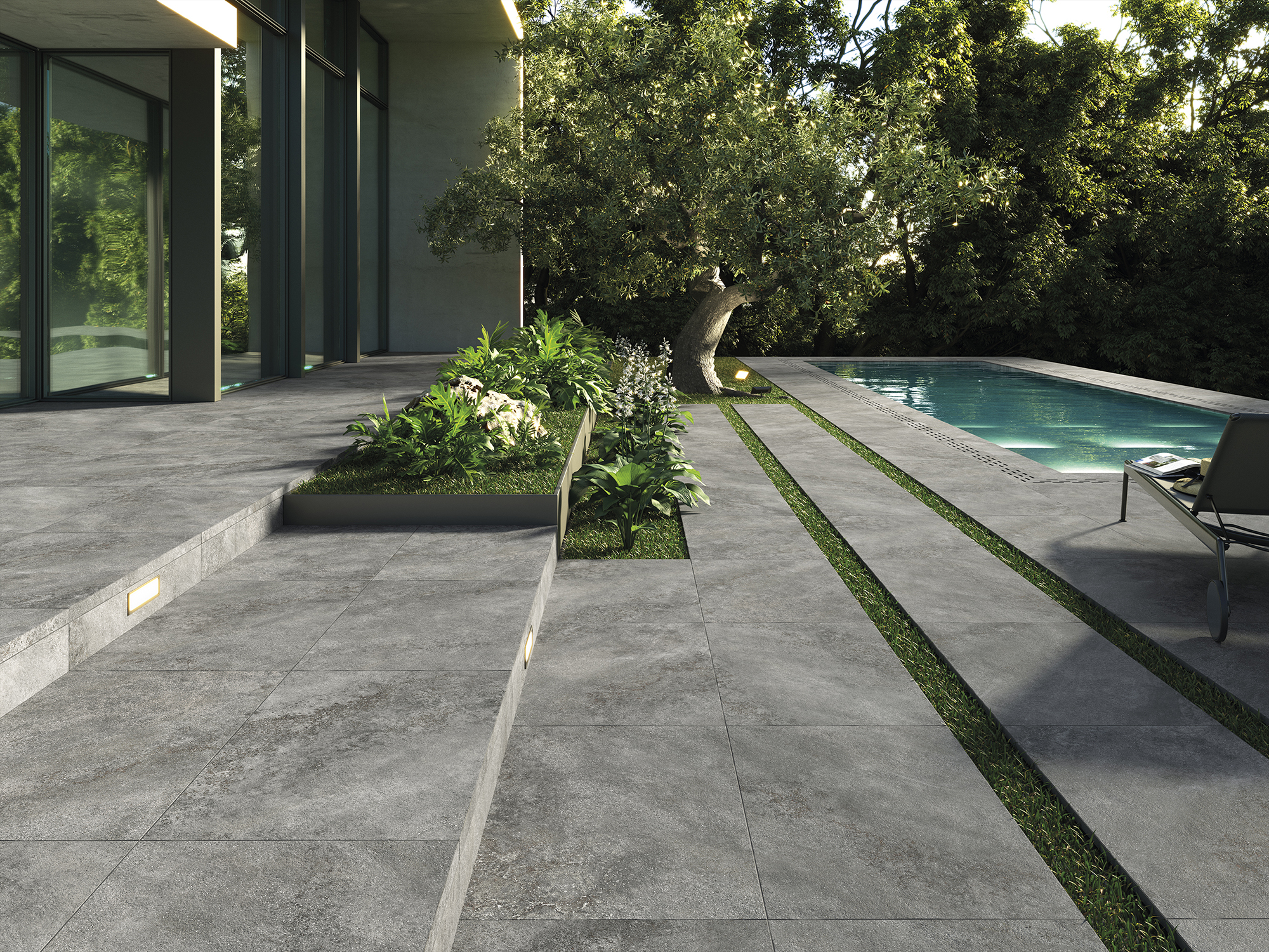 Seine akribische Mischung aus verschiedenen und exklusiven Steinen ergibt eine neue Oberfläche mit minimalistischer Anmutung, die den Innen- und Außenraum zu integrieren vermag.
