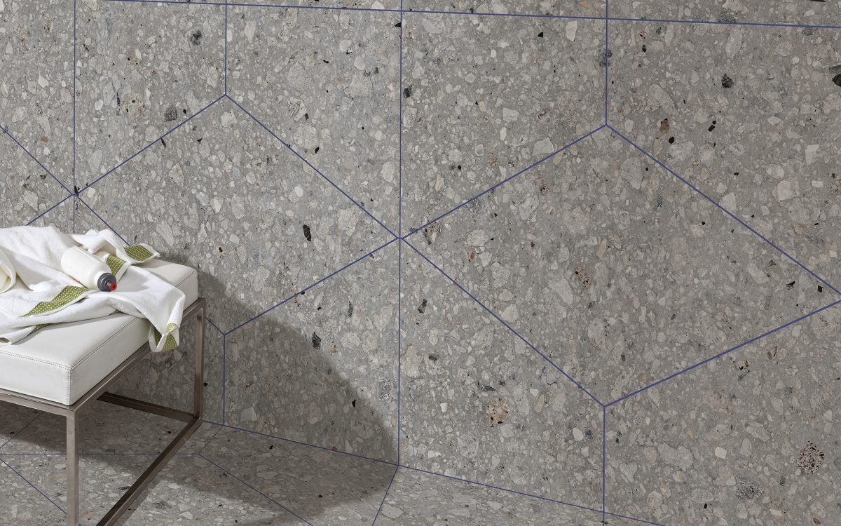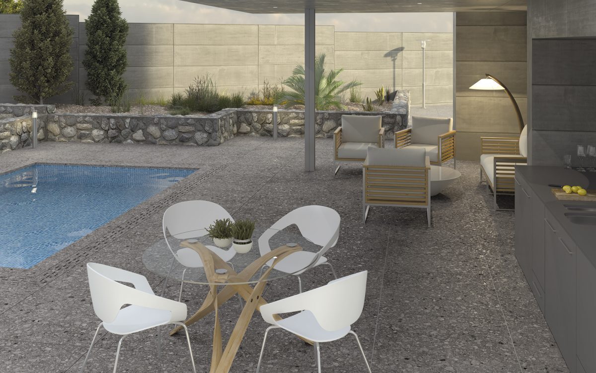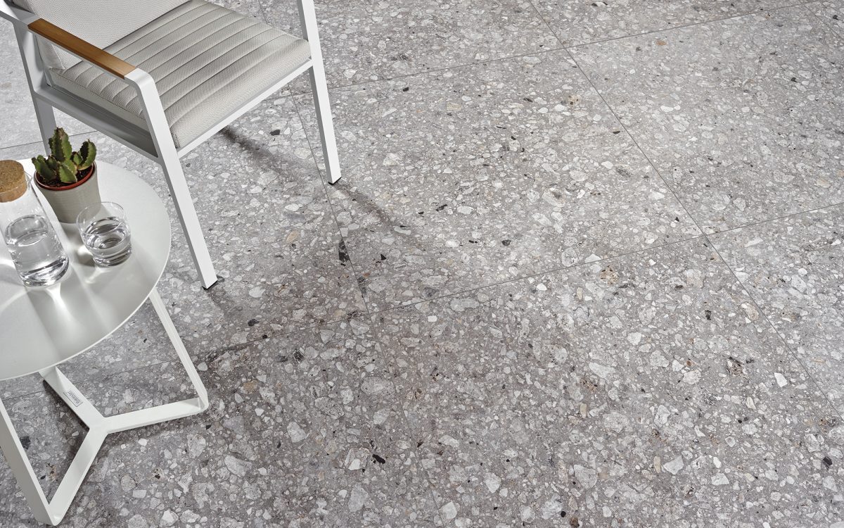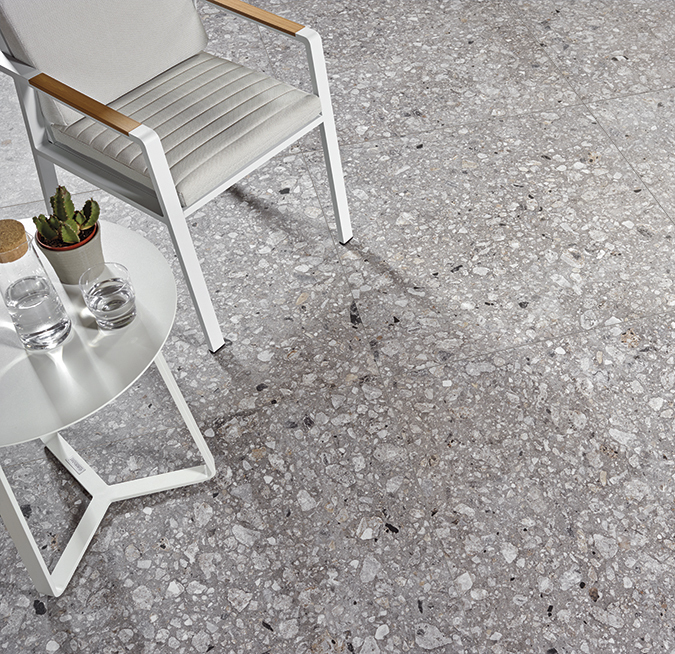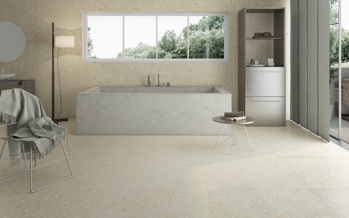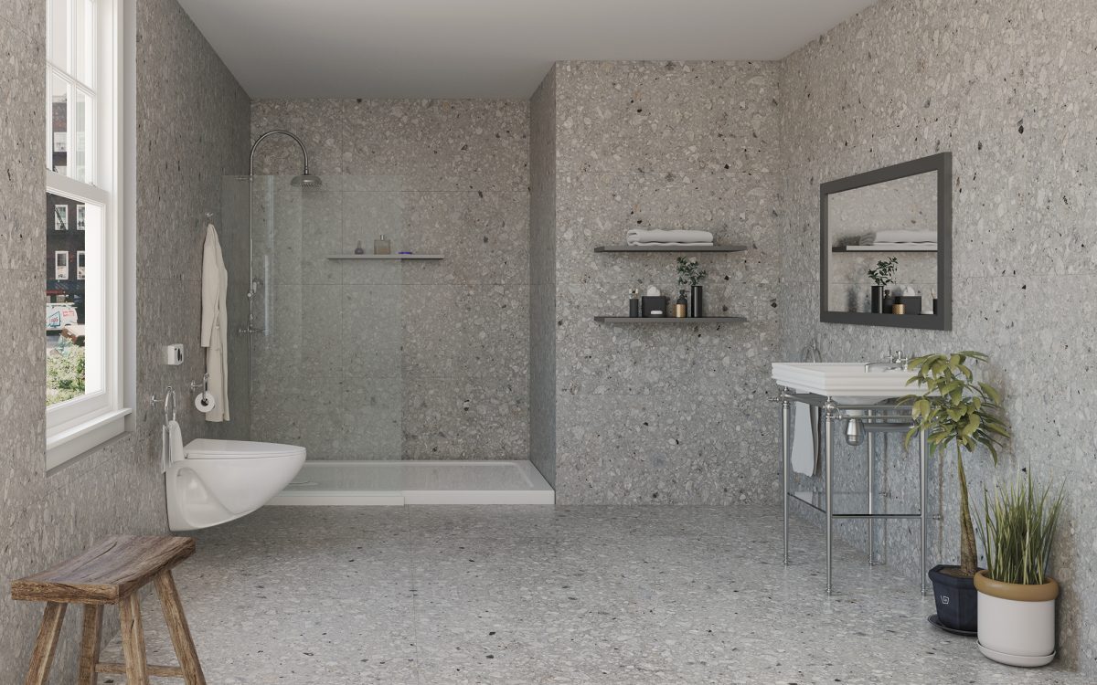 Moon, ein Terrazzo voller Ausdruck und Persönlichkeit. Es bringt Eleganz und Natürlichkeit in Wohnräume, vom Badezimmer bis zum Außenbereich.
