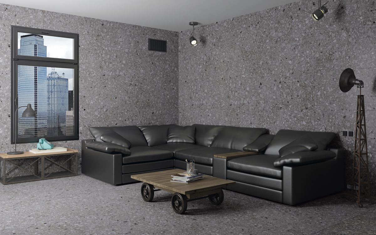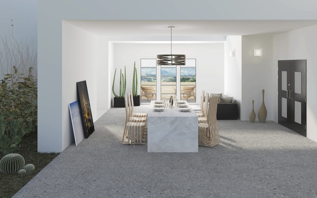 Seine akribische Mischung aus verschiedenen und exklusiven Steinen ergibt eine neue Oberfläche mit minimalistischer Anmutung, die den Innen- und Außenraum zu integrieren vermag.
