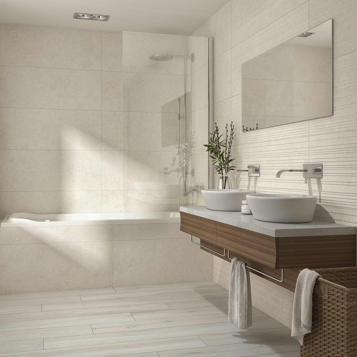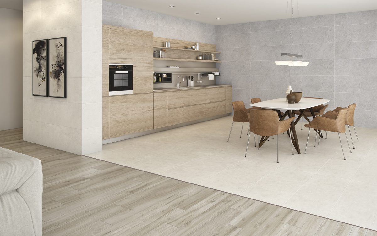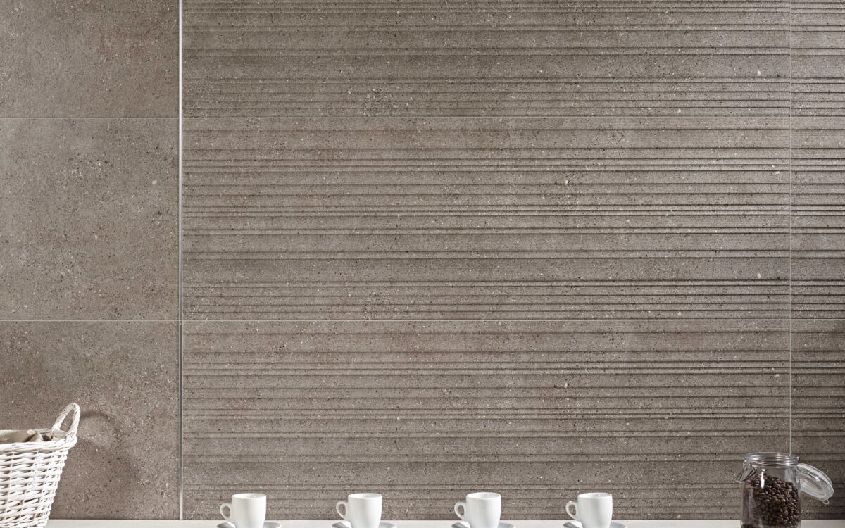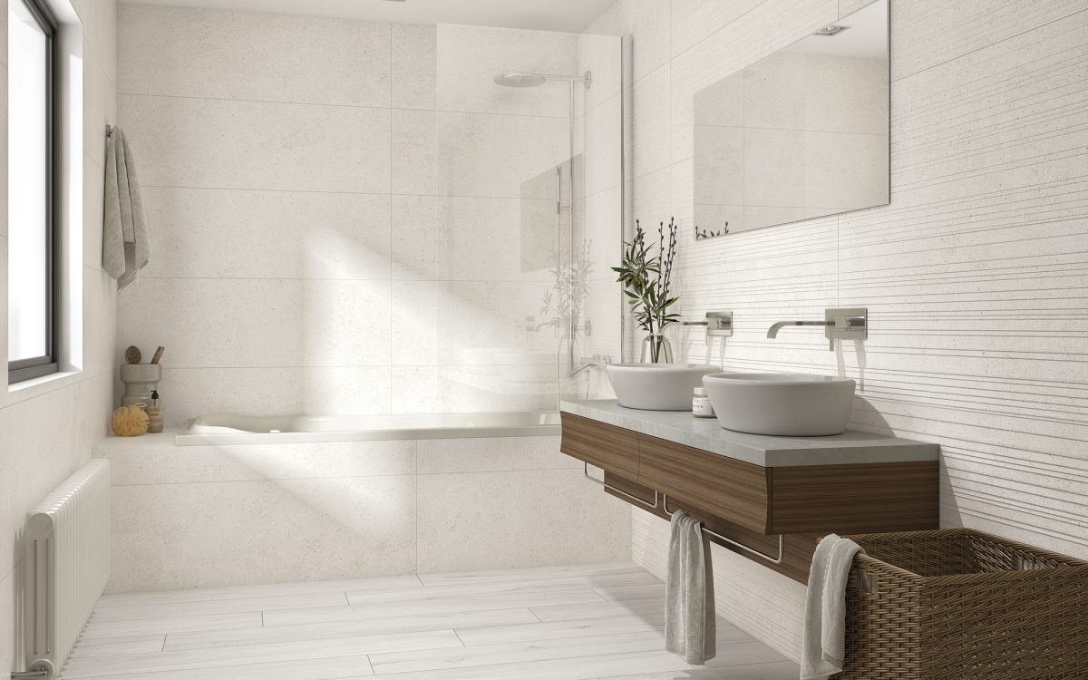 Die 120 cm langen Lamellen erzeugen eine geometrische Abfolge an der Wand, die dem Ambiente einen zeitgenössischen Touch verleiht. Mattes Finish und weiche Textur in Porzellan. Es ist Teil des VIIKER-Sortiments, 40×120 von feiner Dicke, ein äußerst umweltfreundliches Produkt.