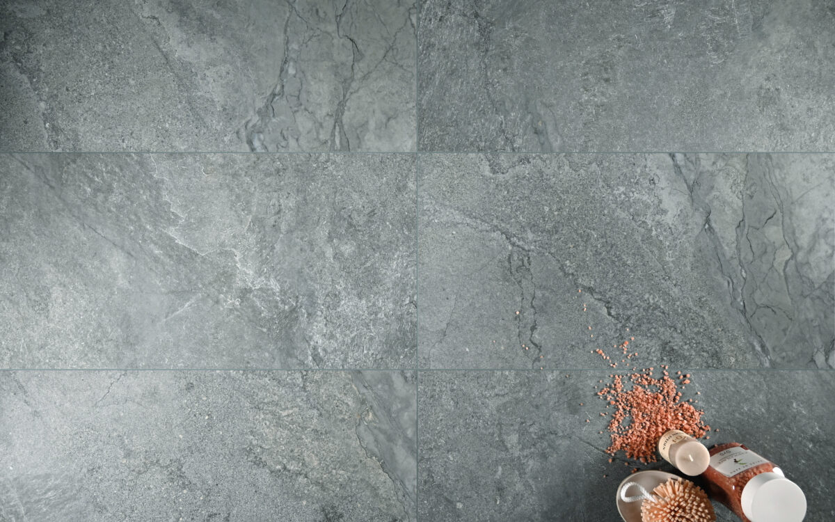 Die Kollektion Slate Mix verbindet die natürliche Eleganz von Schiefer mit der zeitgenössischen Subtilität von Zement und schafft so ein modernes und funktionales Feinsteinzeug.
