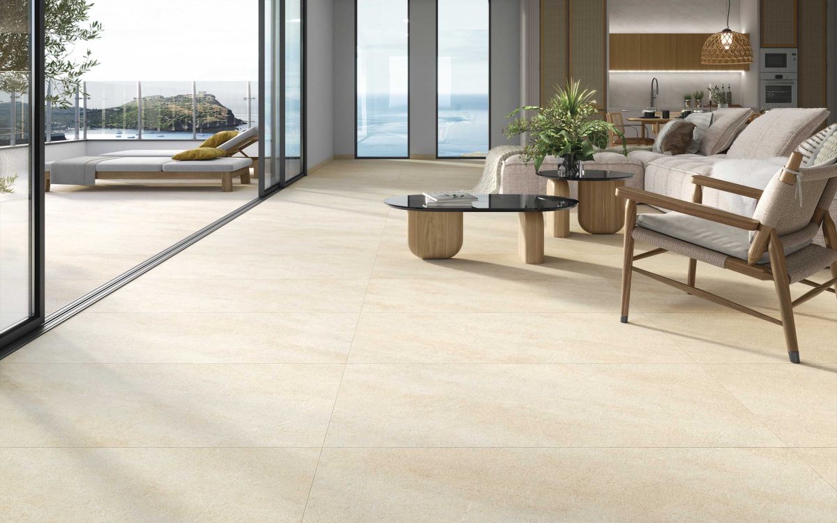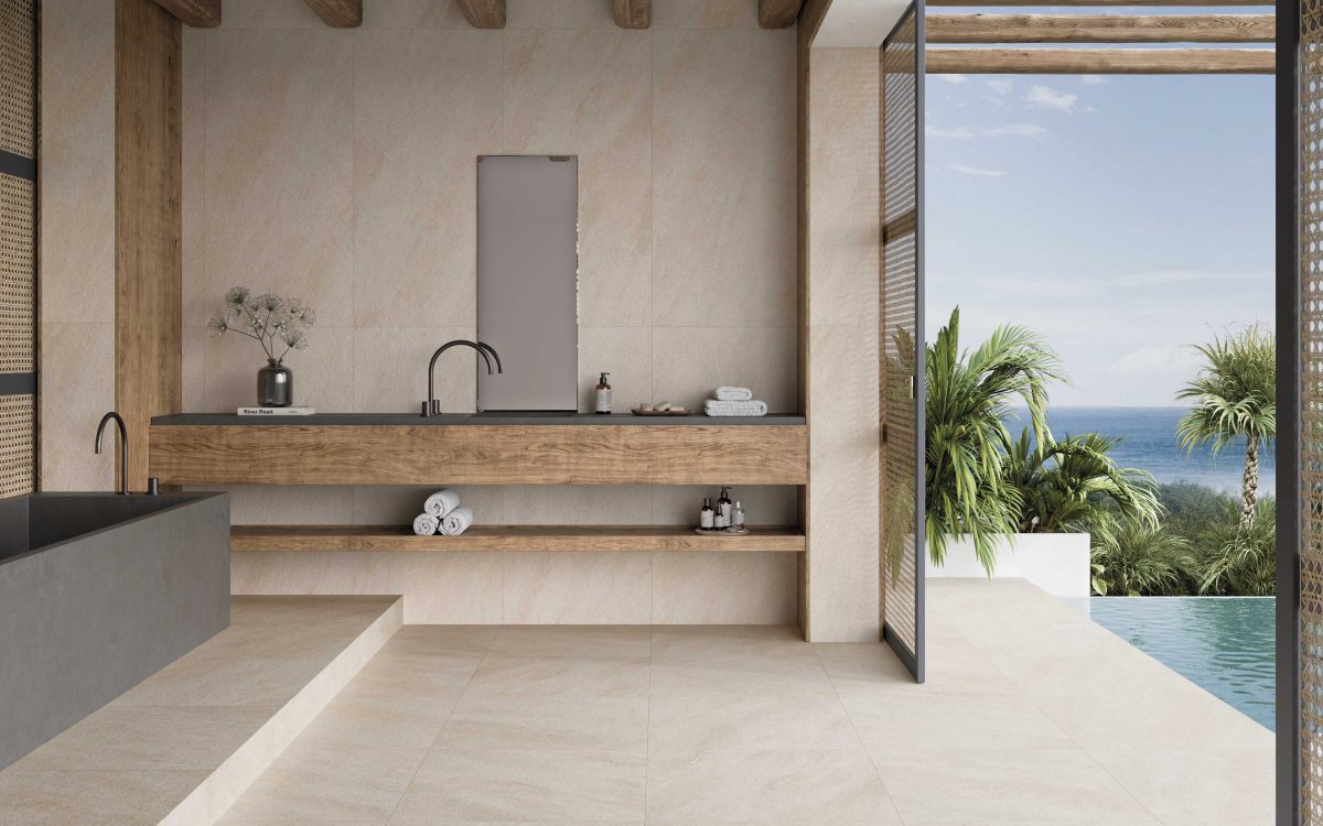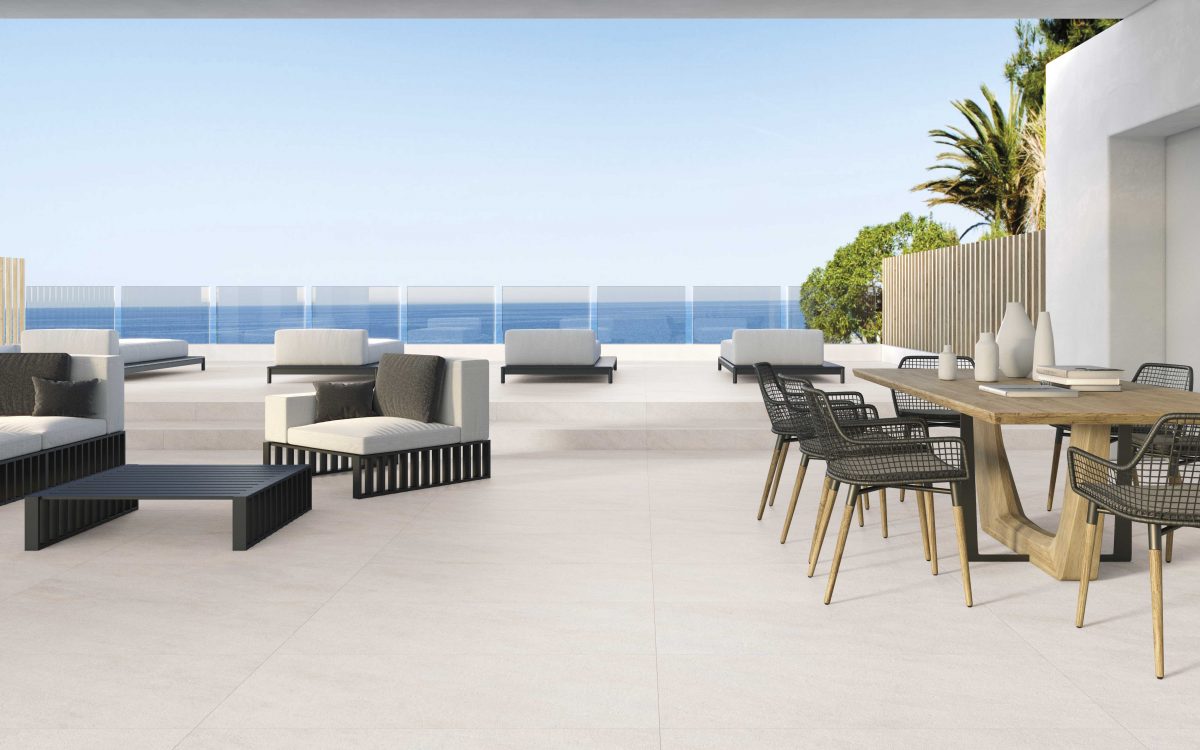Erhältlich in drei verschiedenen Farbtönen, Blanco, Gris und Beige, und in einer Vielzahl von Formaten, sowohl für Innen- als auch für Außenbereiche (OUTDOOR 20).
